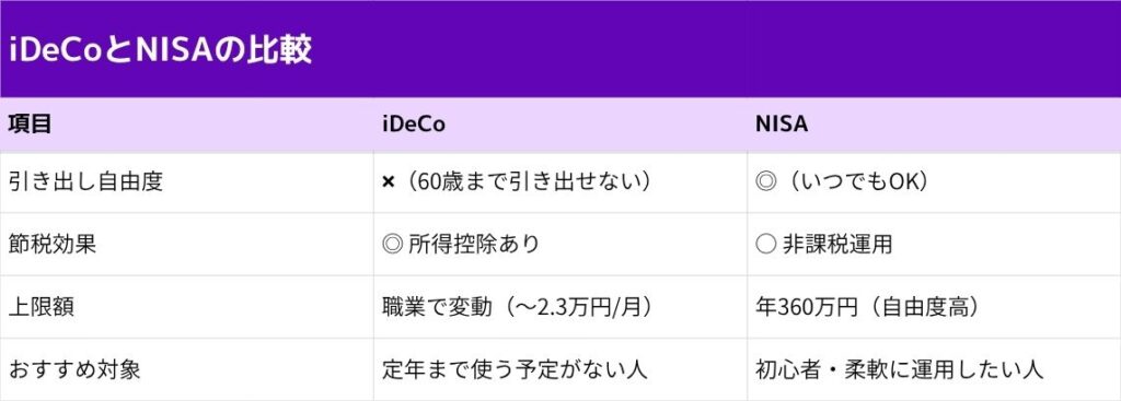 この表を見ると、iDeCoは老後資金専用、NISAは柔軟な用途に向いているってわかりますよね。