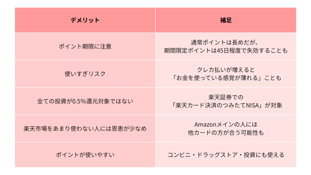 楽天カードは「年会費無料」「ポイント還元率が高い」など魅力が多い一方で、一部注意点もあります。ここでは正直にメリット・デメリットをまとめます。
