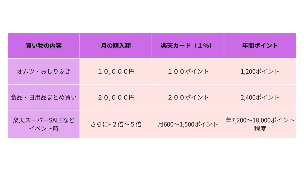 例えば、オムツ・ミルク・日用品などを楽天市場で買う家庭なら、ポイントがどんどん貯まります。